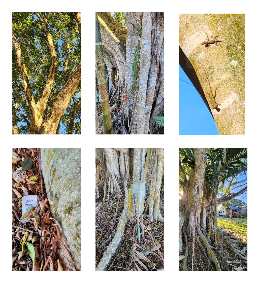 What lived within this banyan fascinated me as much as the tree itself. Home to things earthly and human-made, this tree housed peepers and creepers, hosted morning lizard meetups, collected trash, and coddled young palm trees (at least for the moment).