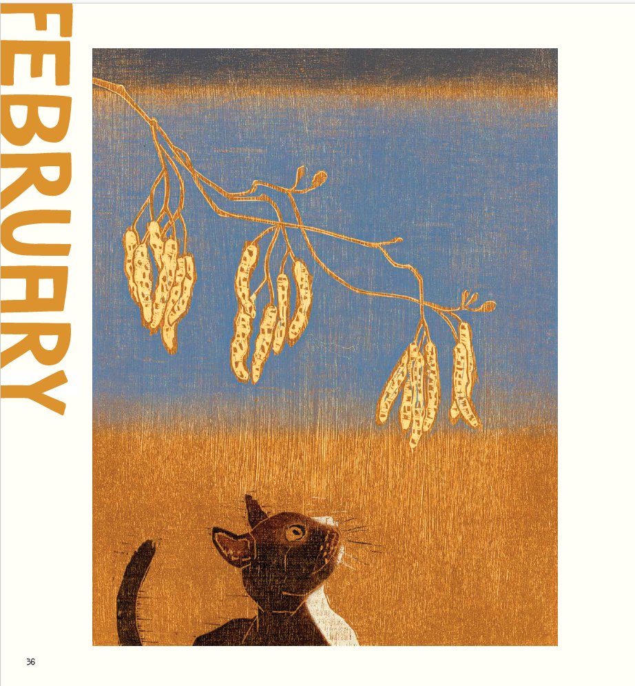 The woodcut illustrations and the beautifully muted color palate capture the mood of each poem. I particularly love the distressed-denim textures of February’s “Frozen Buds.”